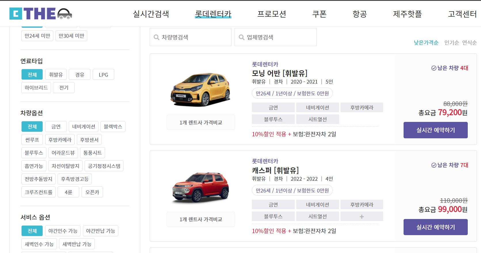 또한 가장 사이트에서 좋은 기능이라고 생각되는 것이 제주 더 렌트카를 포함한 다른 렌트카 사이트를 어떤 곳이 저렴한지 가격 비교를 하며 찾을 수 있는 검색기능인데 상당히 저렴한 곳을 잘 찾아주어 신뢰할 수 있는 업체라고 생각됩니다. 더 자세한 내용은 사이트에서 알아보실 수 있습니다