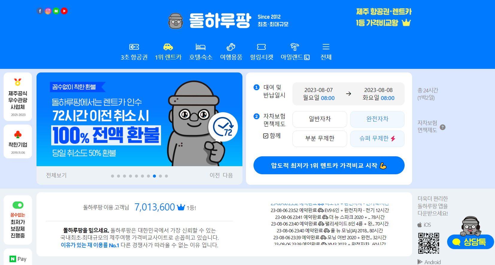 100개 이상의 제주렌트가 업체에서 1만 8천 대 이상의 차량을 비교해 볼 수 있는 곳으로 렌트카를 비교하는데 있어서는 빠질 수 없는 업체로 유명하다고 합니다. 상당수 많은 이용객이 선호하는 업체이며 렌트카 업체를 찾아볼 때 꼭 돌하루팡이 나올 정도로 인정받는 업체입니다.